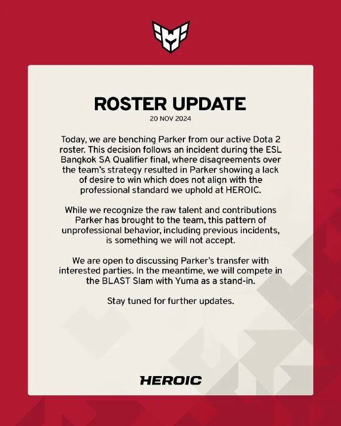 开宫没有回头监,HEROIC下放JimPark,队伍彻底一蹶不振。在接下来一整年的国际比赛中,HEROIC都沦为边缘队伍,视一轮游为家常便饭,并在比赛中贡献了大量的抽象操作集锦。他们用实际行动证明了,如果说JimPark缺少职业道德,那HEROIC的几位队友则多少是缺少职业水平。